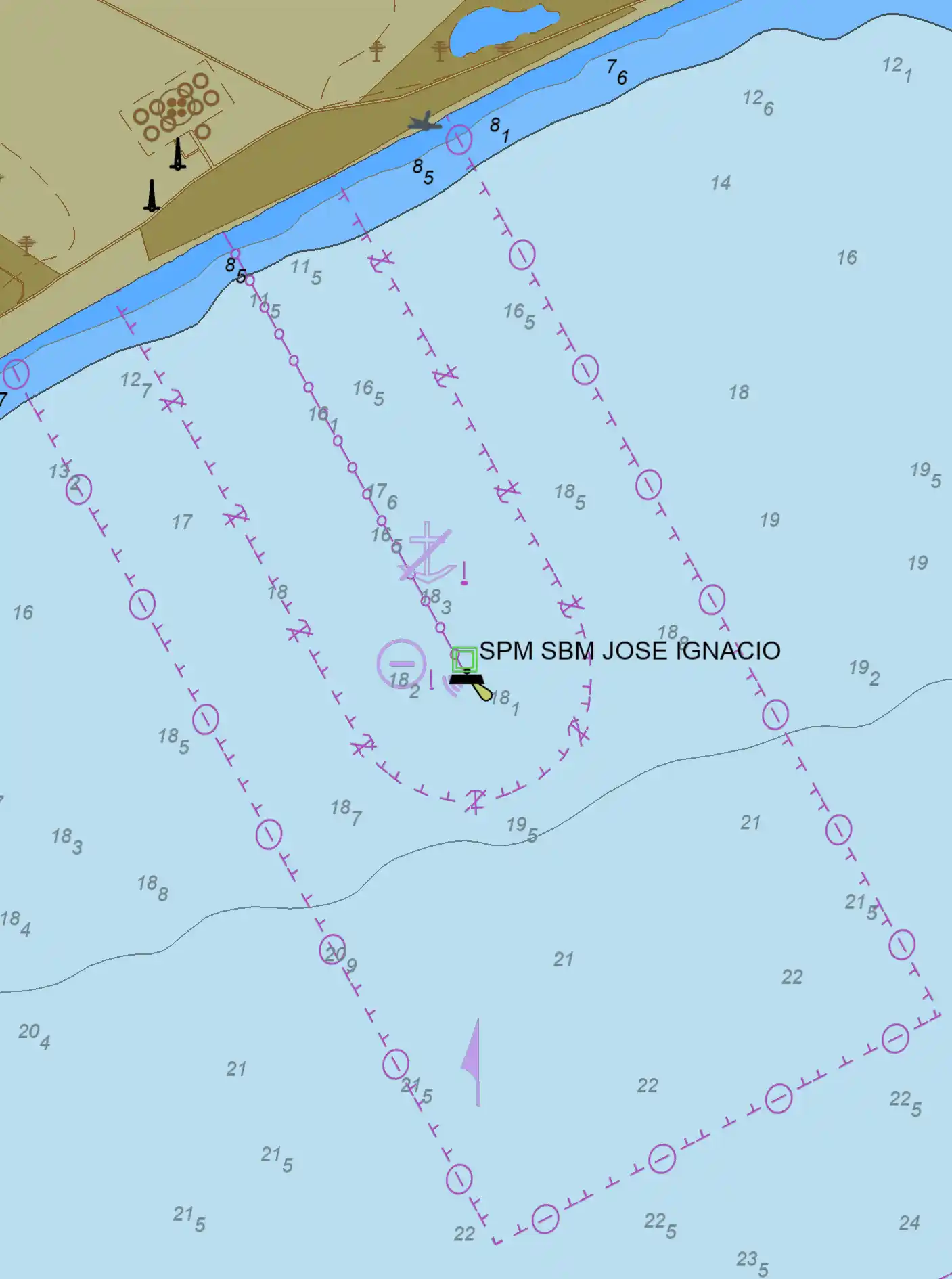 la SBM es de 19 m. El calado máximo con marea baja es de 16,84 m, en marea